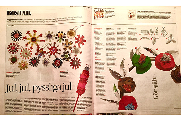 Idag skriver Dagens Nyheter om Julboken och bjuder samtidigt sina läsare på en beskrivning från boken. Så köp dagens tidning och lär dig hur man gör en blomsterkrans av papper och aluminiumburkar.
