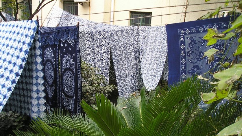 Det finns många sätt att sätta färg och mönster på tyg. Vi får se hur man färgar med indigo och gör mönster med hjälp av träblock, plangi, schabloner, vax och ikatknytning.