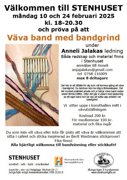 I anslutning till vävutställningen ”Mellan himmel & hav” med Vävnätet Dalarna ordnar vi workshop/slöjdcafé/prova på med vävtema. Anneli Jalakas visar och lära ut grunderna i att väva med bandgrind. Inga förkunskaper krävs. Material finns på plats. Deltagarantalet är begränsat till 8. Först till kvarn.