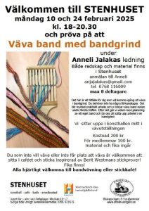 Vid första tillfället pågår även utställning ”Stickat” med Berit Westmans olika sticknings prover. Ta med din stickning och umgås om du inte vill väva eller eller om platserna redan var upptagna.
