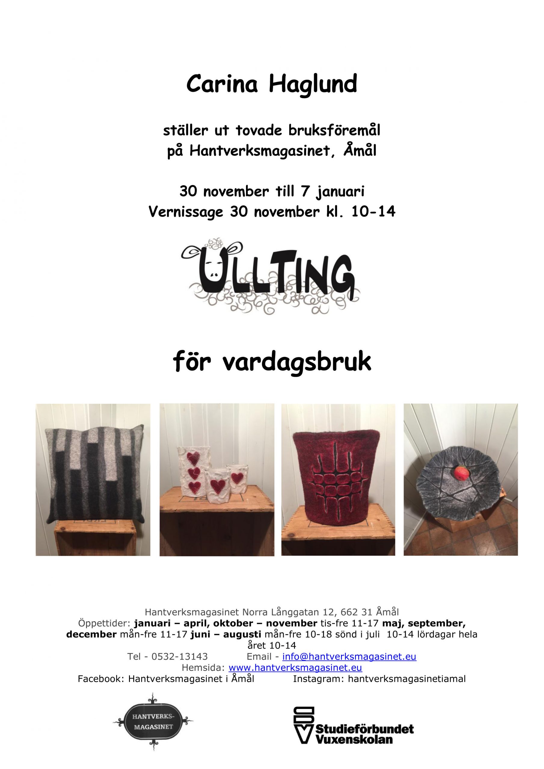 Carina Haglund ställer ut tovade föremål, ”Ullting för vardagsbruk” på Hantverksmagasinet i Åmål den 30 november till 7 januari 2020. Vernissage blir det den 30 november 10-14.