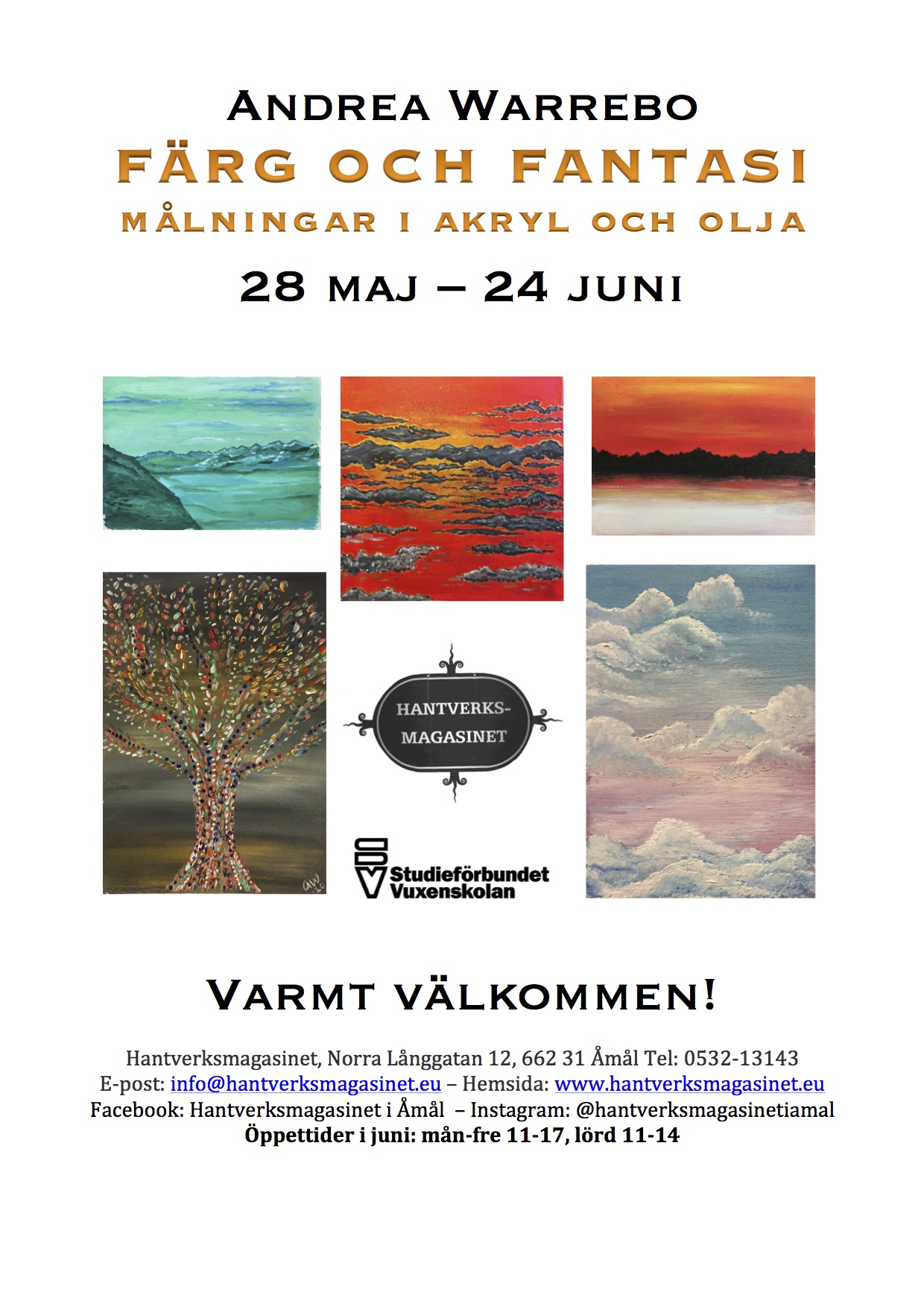 Andrea Warrebo ställer ut målningar i akryl och olja på Hantverksmagasinet i Åmål 28 maj till 24 juni. Hon kallar sin utställning Färg och Fantasi.