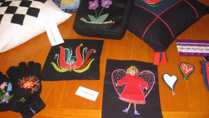 Kristin har broderinålar och broderigarn. Sybågen kan du få låna.