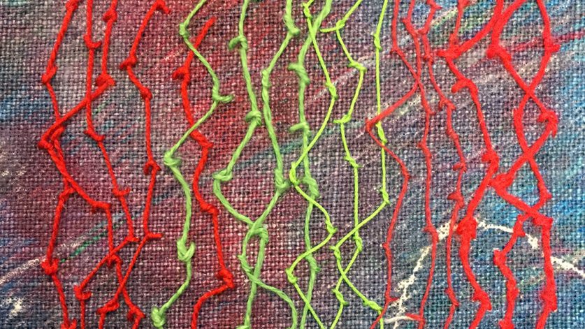 Vi bakar in olika stygnövningar i bildarbetet som t ex atlassöm, klyvsöm, korallstygn, langettsöm, kolbodastygnet, förlängd knut, fransk knut och kanske något mer. Vi funderar över vilket stygn som passar till det uttryck vi vill förmedla. Vi samtalar om vad bakgrunden och bottenmaterialet har för betydelse.