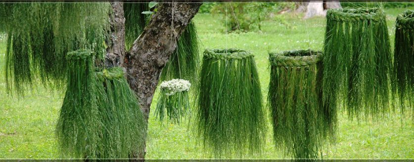 Precis som vanligt samlas vi på Löfstad slott. Vi slår oss ner i slottsparken och binder kronor och kransar av gräs inför den stundande midsommarhelgen och sommarsolståndet.