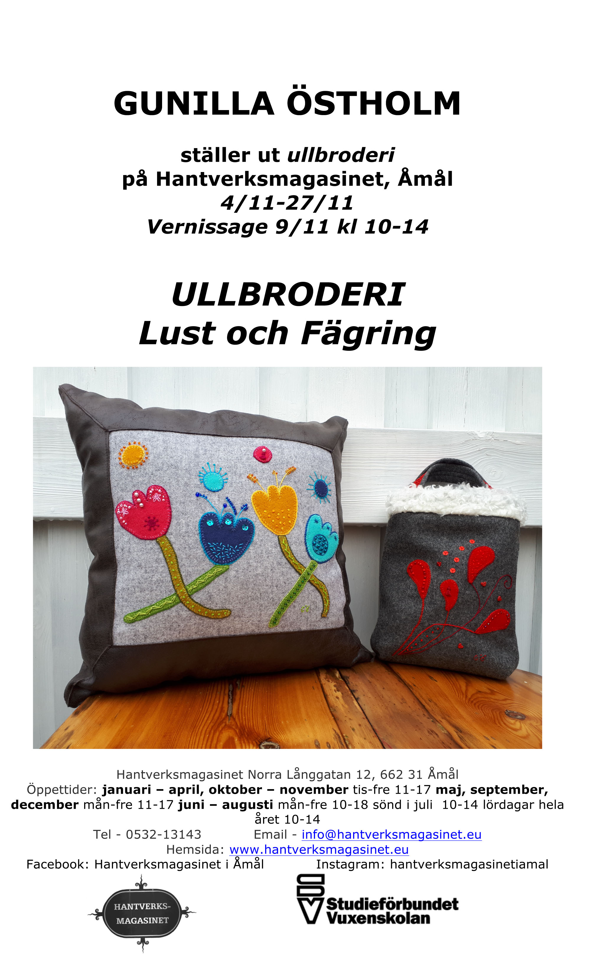 Gunilla Östholm ställer ut ullbroderi på Hantverksmagasinet i Åmål 4-27 november med vernissage den 9 november 10-14. Hon kallar sin utställning ”Lust och Fägring”.