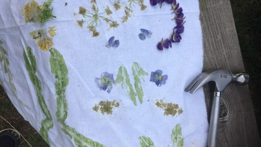 Genom att banka på växter mot textil kan man få avtryck och göra mönster.
