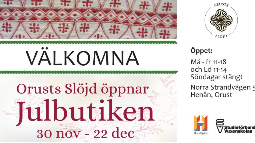 Orusts Slöjds Julbutik med slöjdprodukter tillverkade av medlemmar i föreningen. Här hittar du vackra och praktiska ting av keramik, textil, trä, glas, silver, papper mm. Julklappar till dig själv eller dina vänner.
