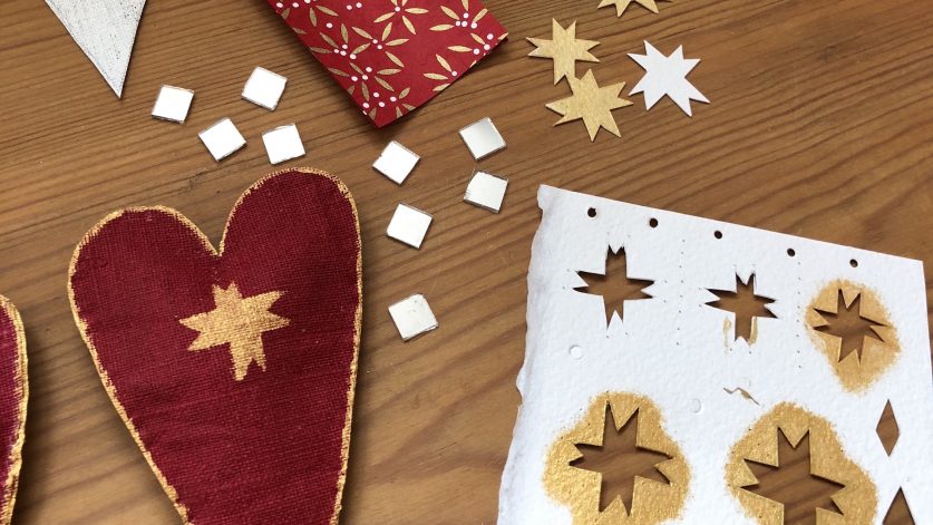 Skapa julstämning med hjärtan att hänga på väggen, i fönstret eller varför inte i granen? Vi målar med limfärg på linnetyg, fyller våra hjärtan med tidningspapper och dekorerar dem sedan med guld, pärlor, paljetter, schabloner, med mera.