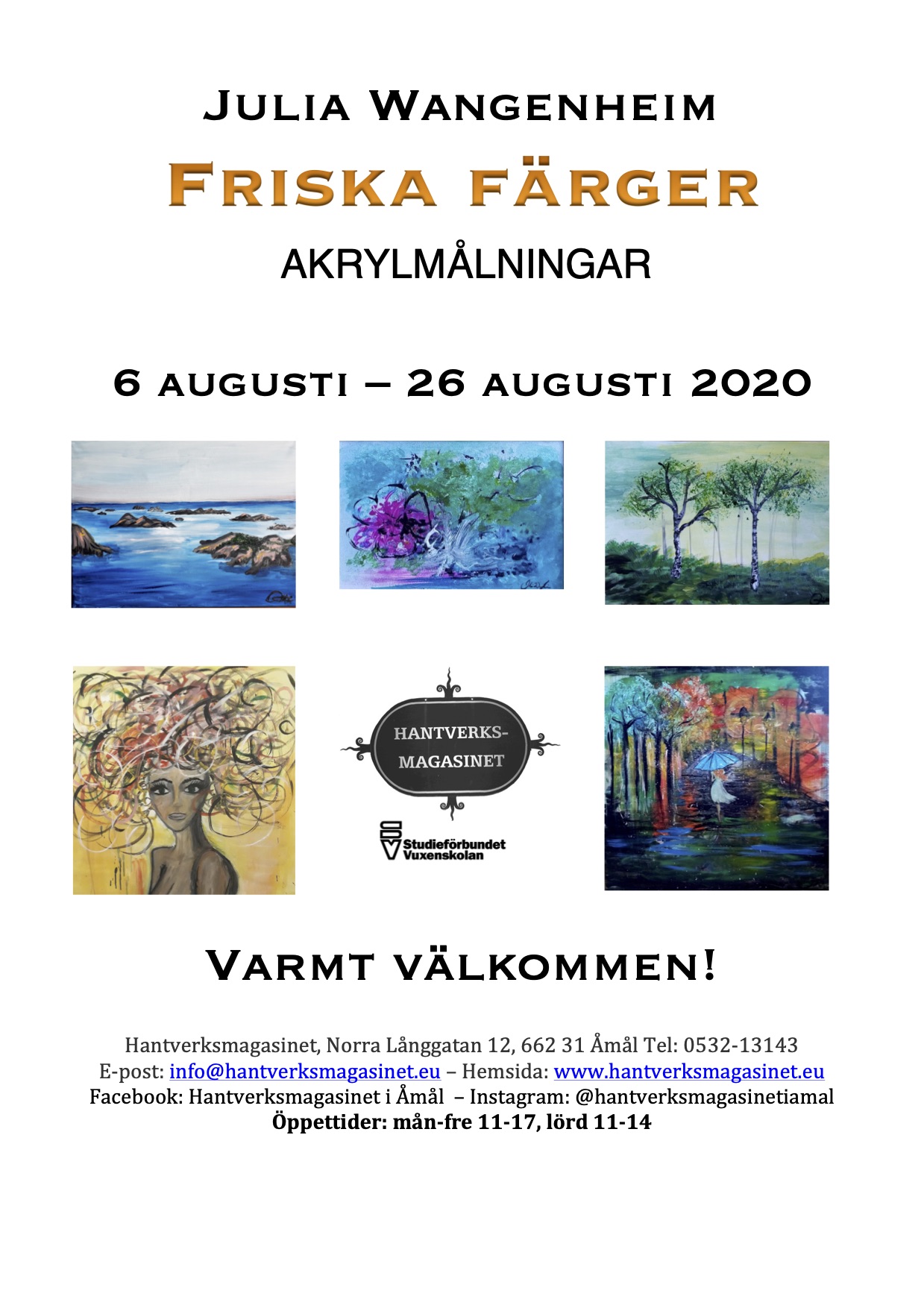 Julia Wangenheim ställer ut akrylmålningar på Hantverksmagasinet i Åmål. Hon kallar sin utställning ”Friska Färger” och finns på Magasinet från den 6  till 26 augusti.