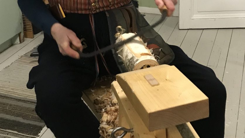 Temat två gånger framåt är att tillverka krympburkar av björk med Johan Sagström. Det är inte så många som kan göra krympburk samtidigt så vi täljer även påsklämmor, schackpjäser, hårnålar och annat som man kan tälja av färsk sly.