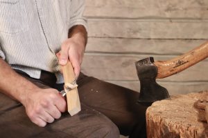 Till höger, en variant på det vanligaste täljgreppet. Under kursen kommer du att få lära dig fler grepp, både täljgrepp med riktningen från och mot dig. Ole kommer också demonstrera hur man täljer med yxa på ett säkert sätt.