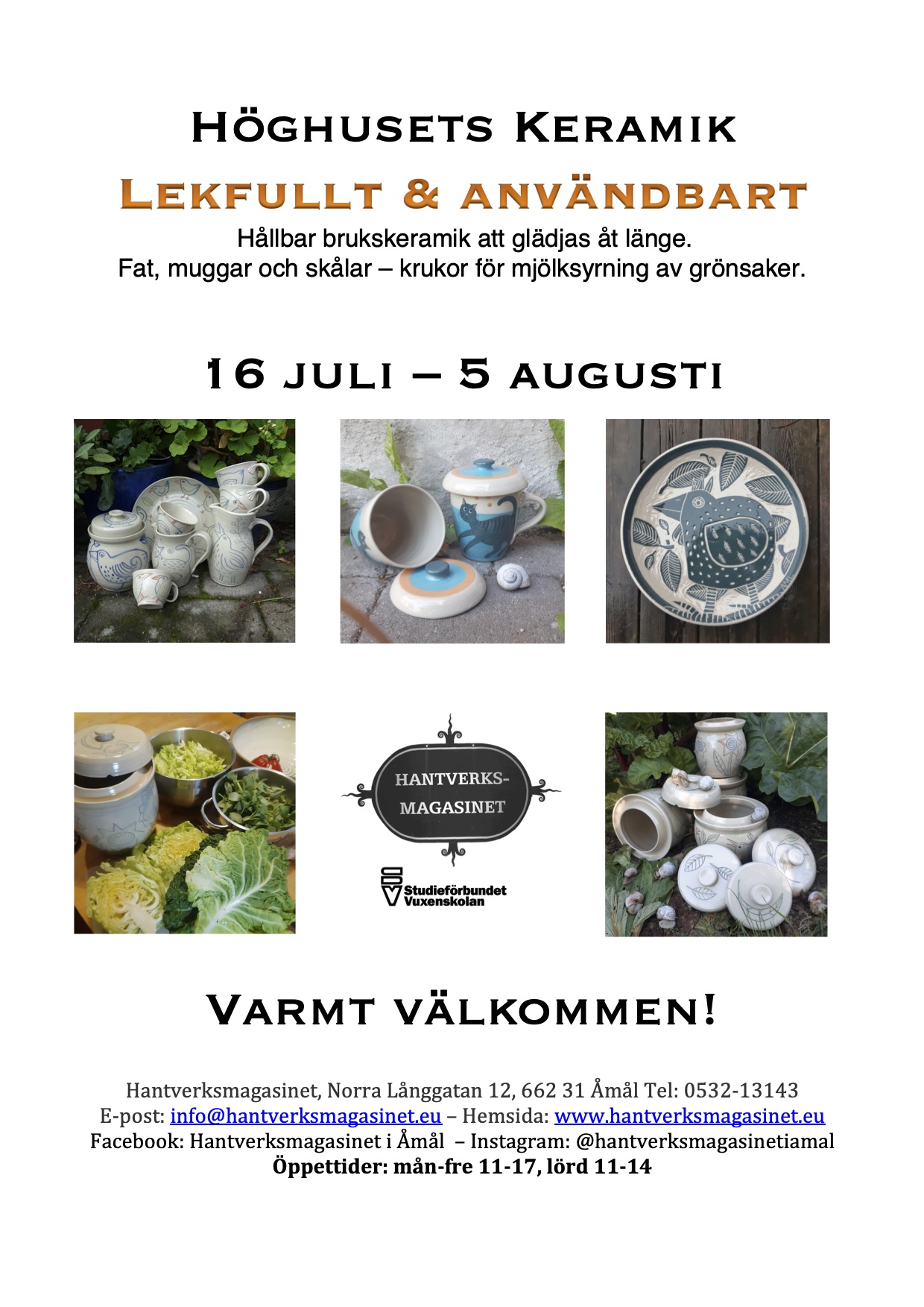 Den 16 juli till 5 augusti ställer Agneta Brogren, Höghusets Keramik, ut hållbar brukskeramik att glädjas åt länge. Hon ställer ut fat, muggar och skålar samt krukor för mjölksyrning av grönsaker.