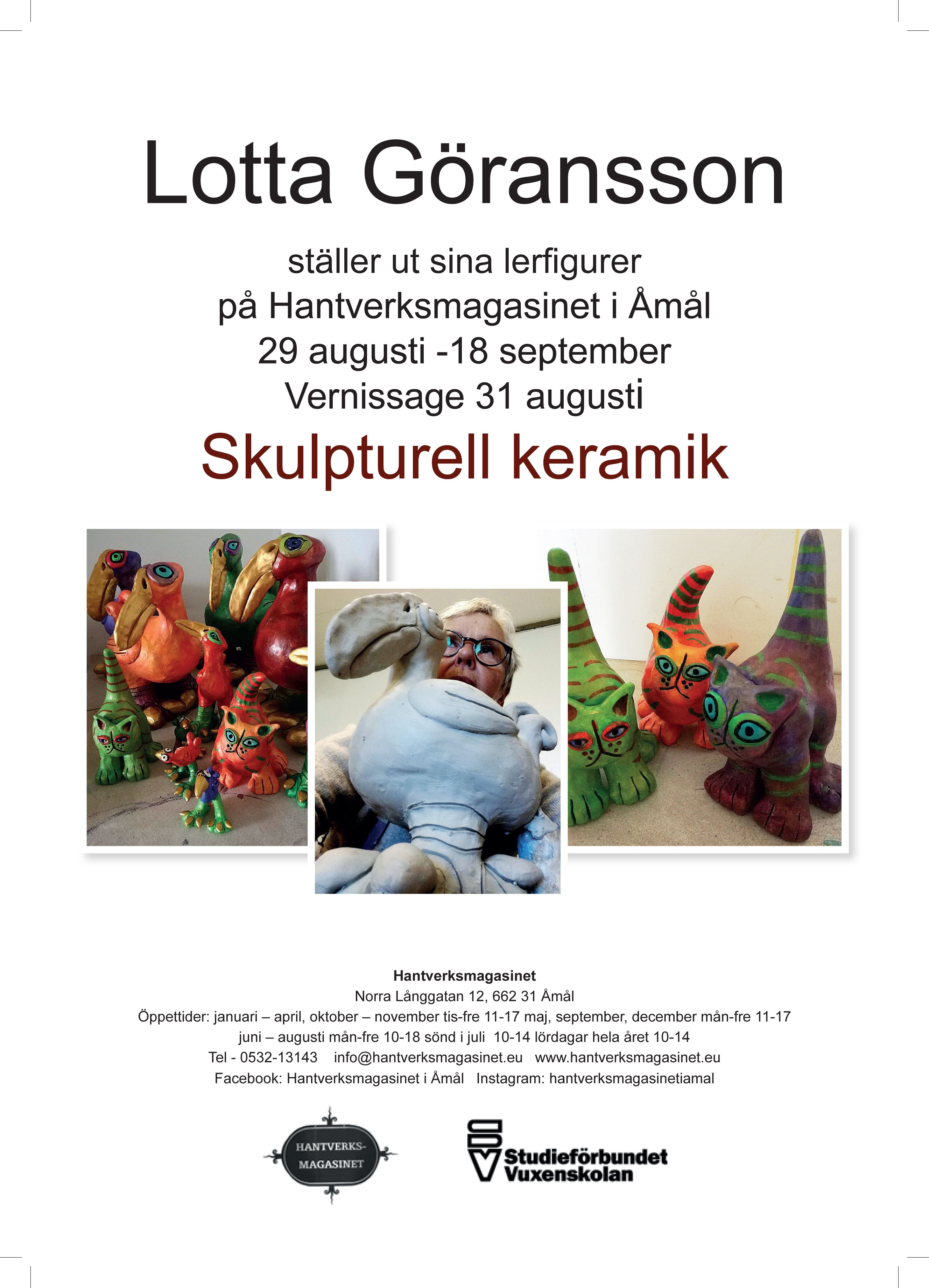 Lotta Göransson ställer ut sina lerfigurer på Hantverksmagasinet i Åmål 29 augusti till 18 september, med vernissage lördagen den 31 augusti 10-14. Hon benämner sin utställning skulpturell keramik. Välkommen!