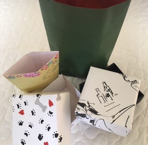 Vi viker vackra askar och påsar till julklapparna av papper från t ex böcker, tapeter och tomma hushållsrullar.