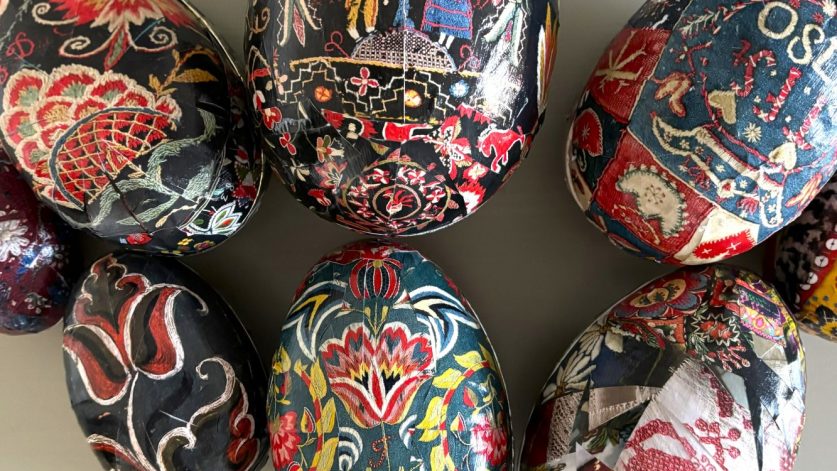 Vi dekorerar påskägg i folkligt inspirerad ton med hjälp av papper och lim. Det finns också möjlighet att göra påsktupp + kyckling i kläde.