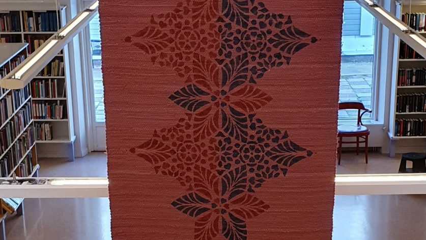 Elena Esmail har med inspiration från mönster på såväl väggar som textiler, stickade tröjor och möbler tagit fram nya mönster. Mönstren har använts dels på nyvävda trasmattor dels inom ramen för vårt projekt Linoleum – bruk och återbruk.
