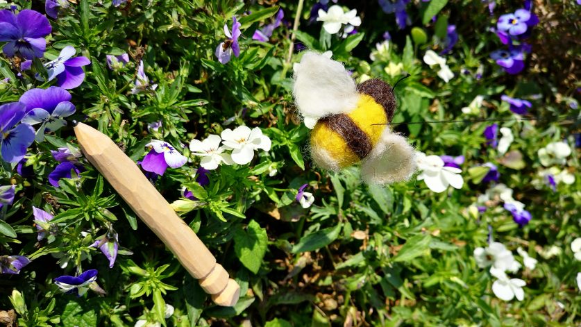 Vi våttovar med ull och såpa ett bi som vi sedan fäster på en pinne så att det kan flyga omkring.