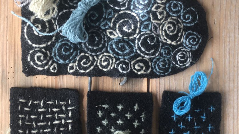 Tekniker: Fritt broderi, sashiko, virkning mm.