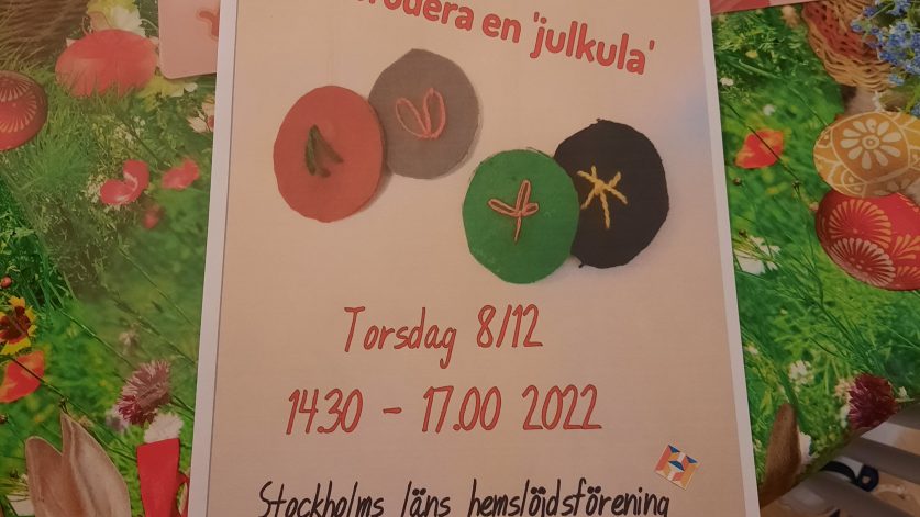 Kom förbi och brodera en julkula! Våra medlemmar på plats berättar också om föreningen och vår verksamhet.