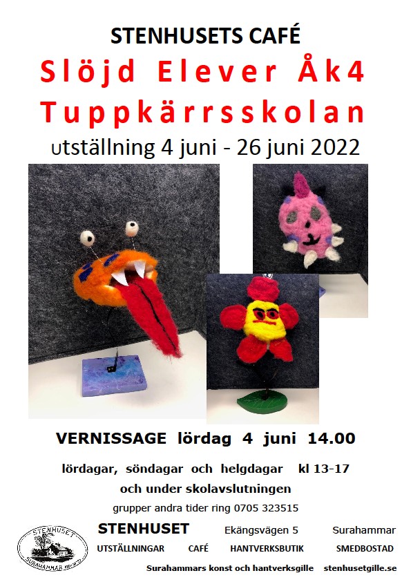 Elever ÅK 4 Tuppkärrsskolan i Surahammar visar färggranna och roliga skulpturer & figurer i olika tekniker och material de gjort i slöjden under året