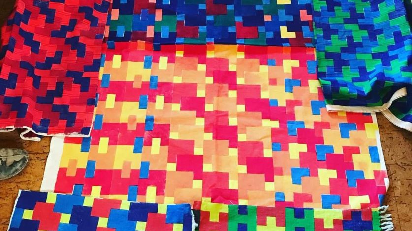 Tryck på tyg – tryck fyrkanter, trekanter och cirklar, gör figurer och mönster.
