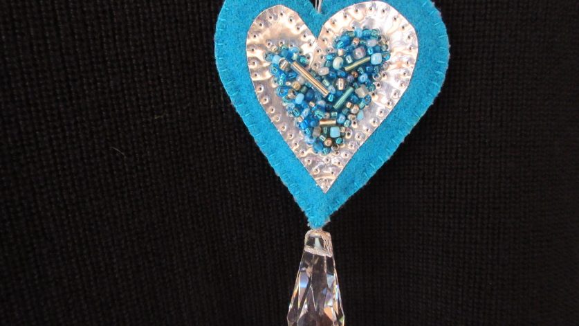 Slöjda en personlig hjärtbrosch eller hängsmycke i kläde, pärlor och återbruksplåt. Ta gärna med tunn aluminiumplåt från uppläggningsfat/kattmatsburkar eller plåt från kaviartub. Har du pärlor / prismor du vill använda – ta med. Svart vaxat bomullssnöre till halsband finns att köpa.