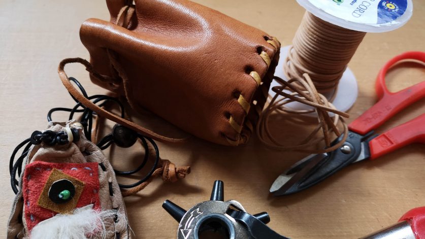 Vi gör små börsar och armband i läder, passar både barn och vuxna. Barn under 13 år välkomna i vuxens sällskap.