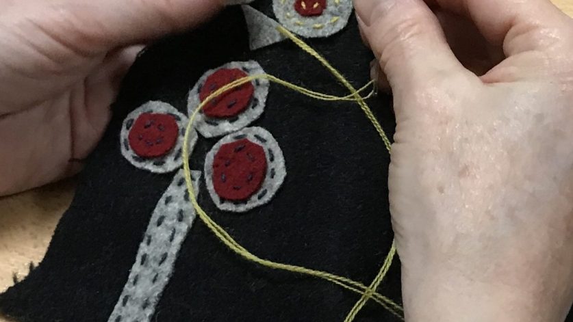 Vi jobbar med våra egna hantverk eller provar på broderi. Det finns material för att prova på olika typer av broderi. Det här är tredje gången av tre med temat broderi.