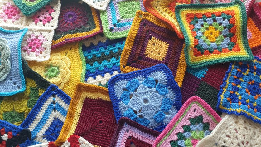 Ta med eget hantverk, eller prova att virka mormorsrutor. Material, mönster och verktyg finns på plats, men om du har egen virknål är det bra. Har du eget garn kan du naturligtvis använda det.