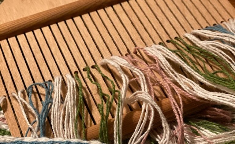 Tema: Gör din egen bandgrind och väv band. Första dagen får du tälja din egen bandgrind (en typ av minivävstol) och andra dagen väver du ett eget band i den.
