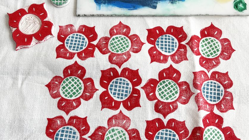 Ta med: Kläder, tygkassar eller fina tyger. Kanske har favoritduken fått en fläck du kan trycka en fin detalj över. Det blir också väldigt fint att brodera över det tryckta.