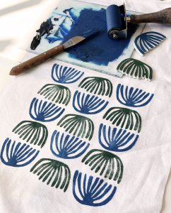 Ta med: Kläder, tygkassar eller fina tyger. Kanske har favoritduken fått en fläck du kan trycka en fin detalj över. Det blir också väldigt fint att brodera över det tryckta.