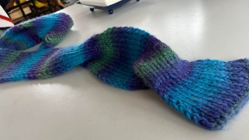 Förbered inför kursen genom att sticka en fyrkant. Lägg upp 28m och sticka resår 1r, 1a tills du har en kvadrat, maska inte av. Använd lite grövre garn och raka stickor. Du behöver också fem strumpstickor, en storlek större.
