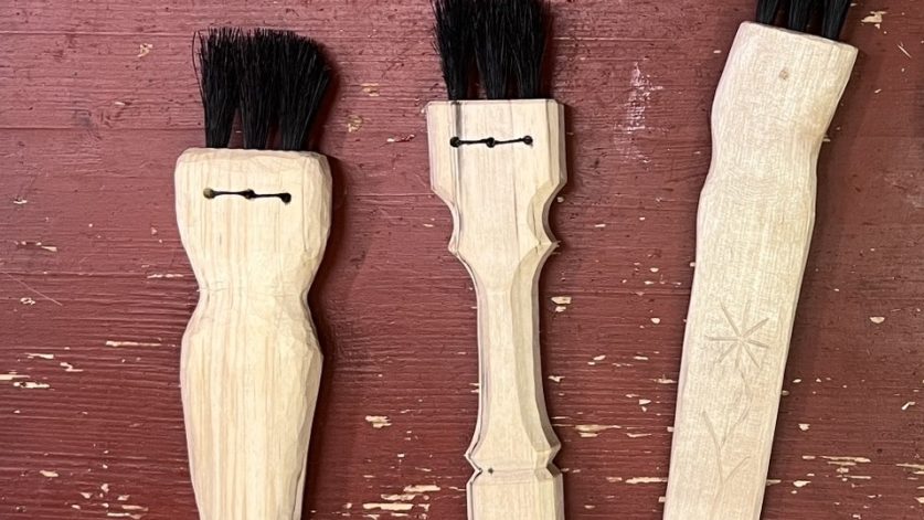 Med hjälp av kniv, yxa och bandkniv formar du och binder en egen liten borste av björk, tagel och lintråd.