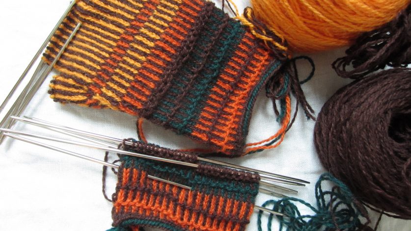 I tvåändsstickning använder man två garnändar – trådar – som man hela tiden växlar mellan. Det blir en vacker och hållbar stickning, som passar perfekt till exempelvis vantar.