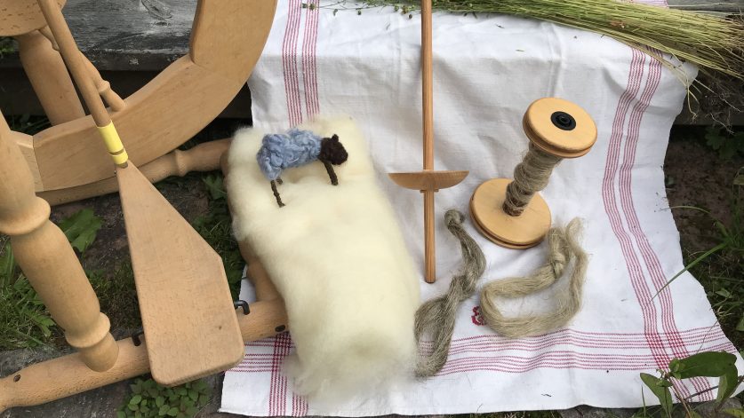 Sen kan du välja om du vill karda ull, spinna ull eller lin eller spinna ditt eget material. Vi har med ull och lin, kardor och sländor samt en spinnrock.