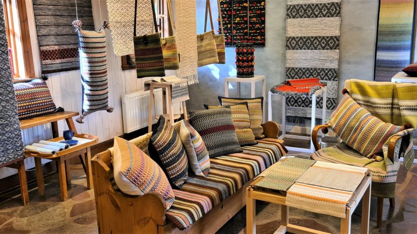 Nu kan du se resultatet från vävutmaning som vi startade upp tidigt i våras tillsammans med hemslöjdskonsulenterna. Med inspiration från våra samlingar och kunskap från vävkunniga har alla som vävt rosengång under 2021 haft möjlighet att lämna sitt bidrag till utställningen. Ca 60 bidrag lämnades in, allt från en tunn skir halsduk i ull/silke till grova trasmattor med rosengångsbårder. Här ser man verkligen rosengångsteknikens alla fantastiska möjligheter. Det har även funnits en vävutmaning för barn och unga tillsammans med Balthazar Science Center i Skövde. Gubbar på rymmen var temat och här gällde det att väva gubbar på kartongbitar.