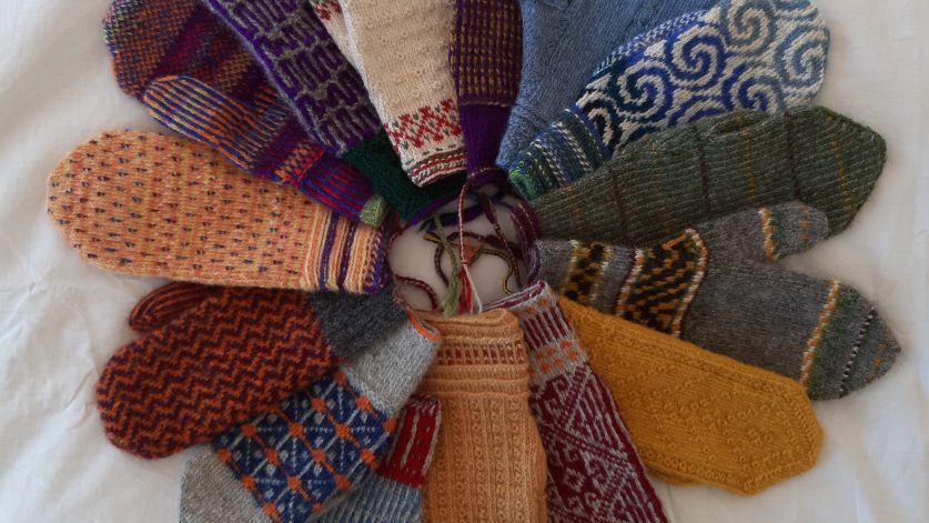 Ta med: tvåtrådigt ullgarn, gärna z-tvinnat, i ett par olika färger, strumpstickor eller rundsticka 2½ eller 3, en stor säkerhetsnål, papper och penna.
