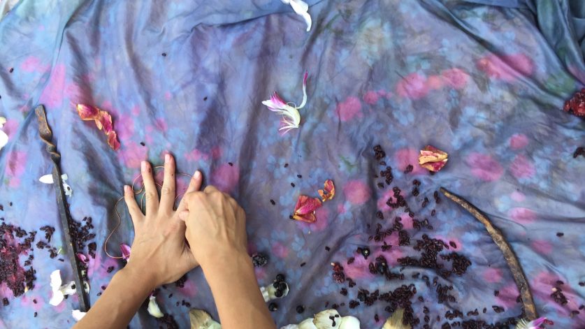 Under två dagar växtfärgar och skapar vi mönster på tyg av olika kvalitéer med bland annat björklöv, lökskal, blommor, granatäppleskal, bönor, svart ris, krapp och bresilja.