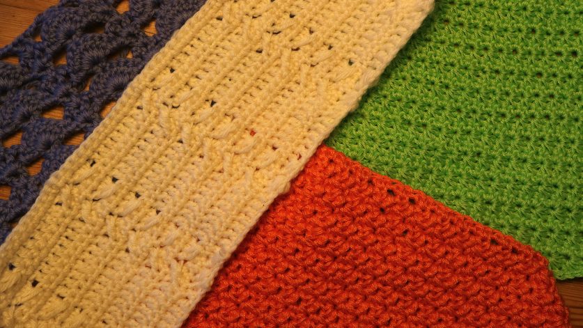 Olika former av virkade mönster såsom snäckmaskor, muscher, popcorn och olika relief mönster.