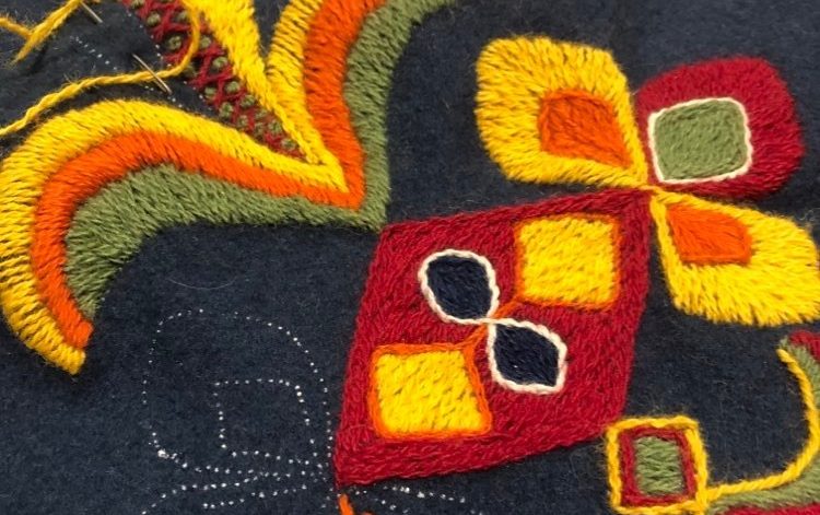 Brita Dixelius och visar hur man broderar en nåldyna i yllebroderi.
