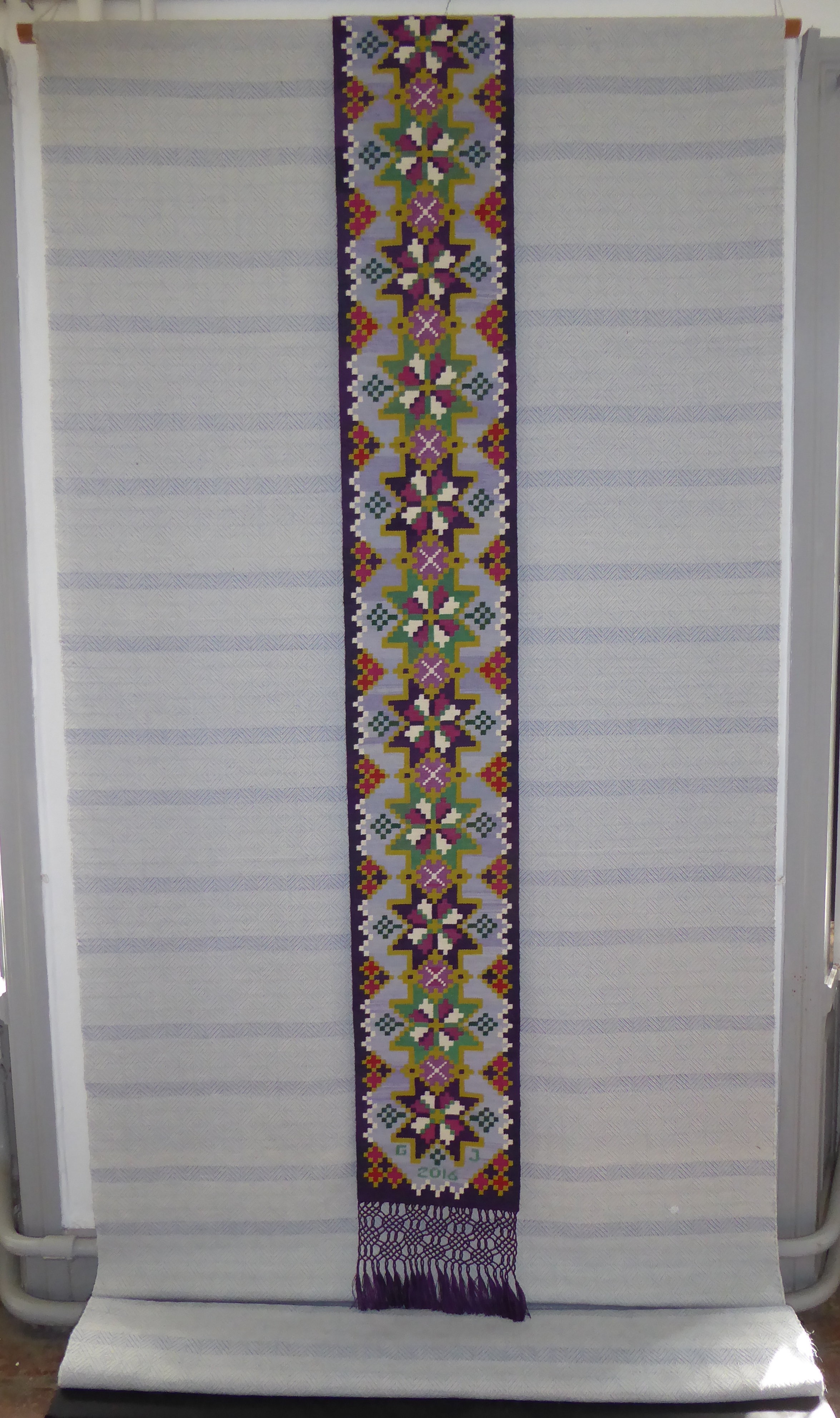 Sedan ett par år tillbaka arbetar jag med egna projekt där jag inspireras av formspråk och tekniker i skånska vävnader för t ex mässhakar i damast, altarbrun i krabbasnår och bårtäcke med rölakan, krabbasnår och dukagång, tekniker som ingår i den skånska konstvävningen.”