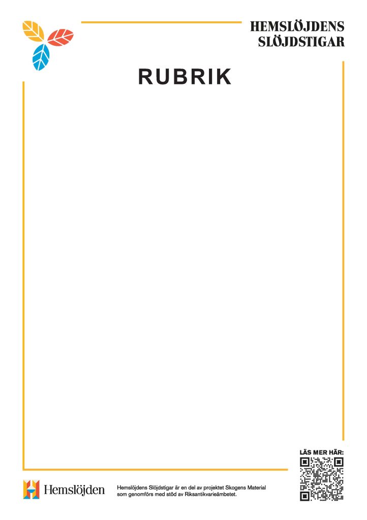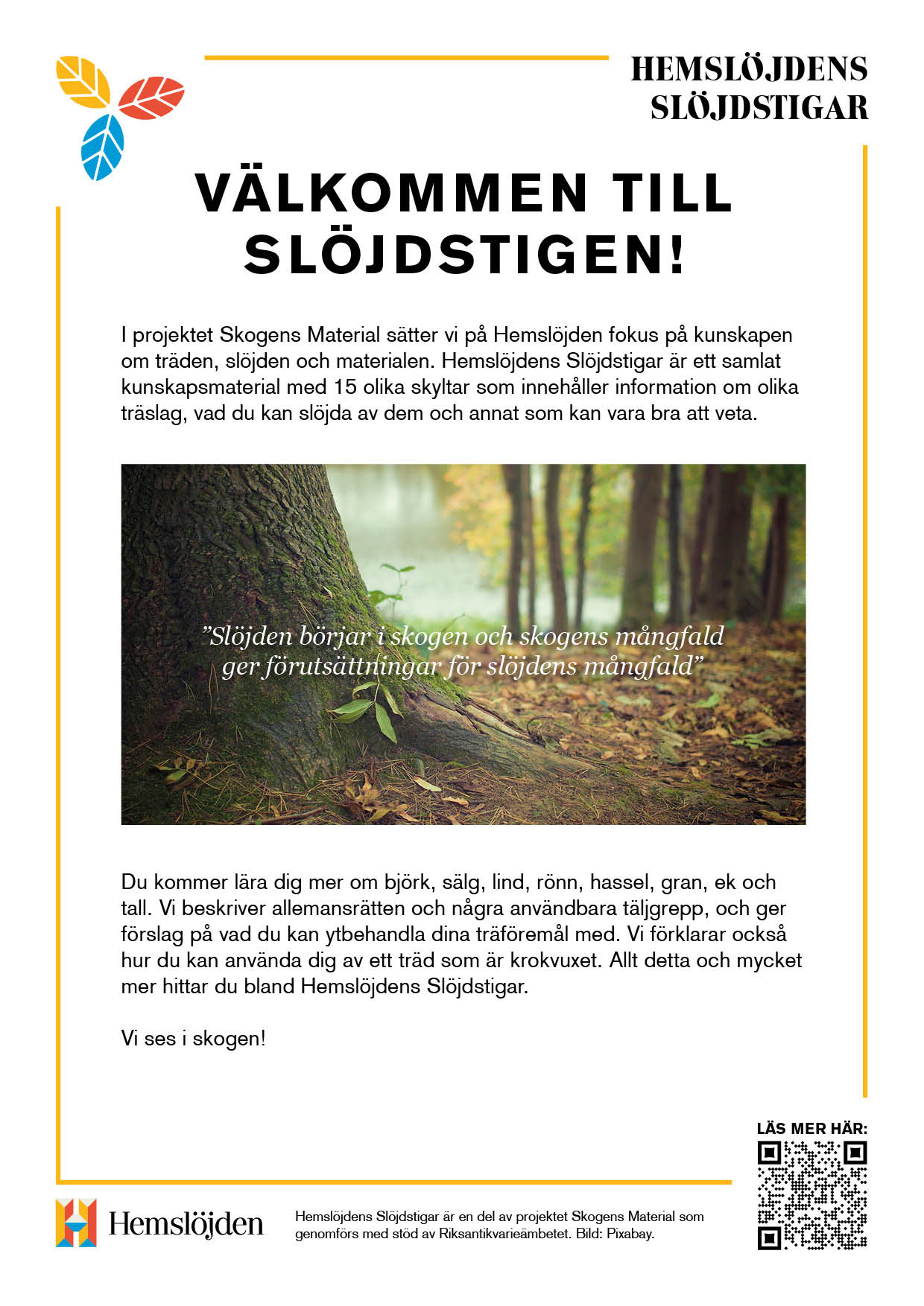 Hemslöjdens Slöjdstigar handlar om träden, slöjden och materialen. Det innehåller ett nedladdningsbart material med 15 skyltar i Pdf-format för våra medlemsföreningar att använda i sin verksamhet. Ni kanske sätter upp en egen slöjdstig i närområdet med materialet som utgångspunkt? Eller så samarbetar ni med en närliggande skola som vill lära sig mer om att slöjda av skogens material? Ni kan använda alla sidor eller bara vissa, välj det som passar er bäst. Som ett tillägg till skyltarna finns det även en sida där ni själva kan lägga in egen information, som har samma mall och utseende som de förifyllda.