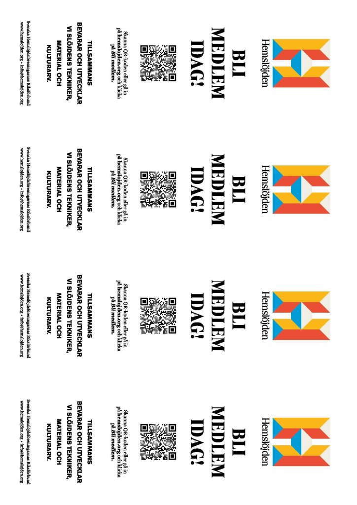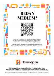 Vi har tagit fram en mall för en affisch som är 50x70cm stor som passar till en trottoarpratare eller liknande. Den har en sida med föreningens namn+webbadress och en sida där det finns plats att fylla i program eller annan information, samt en qr-kod som tar besökaren till slöjdkalendern. Affischen passar till exempel bra på Hemslöjdens dag!