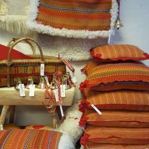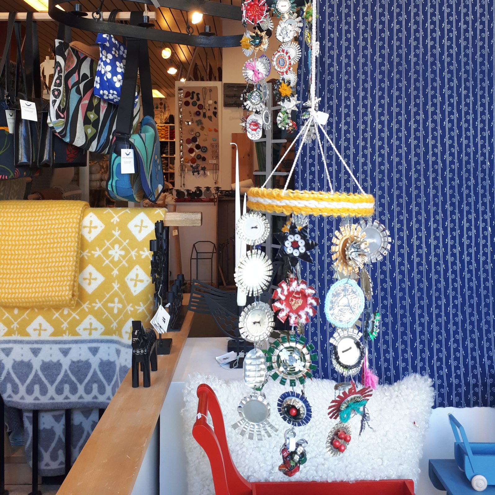 - butiksfönstret på Dalarnas Hemslöjd med återbruksoro, filtar och blåtyg