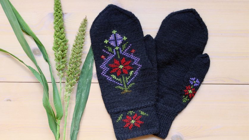 Cast on 68 stitches and divide onto four needles, 17 stitches on each. Knit three rounds of knit one, purl one. Now knit 23 rounds like this: Needle one and two, knit one, purl one.. Needle three and four, knit. Next two rounds, knit one, purl one on all needles. Knit two rounds and increase one stitch on the back of the hand. Mark the center stitch as the center of embroidery.