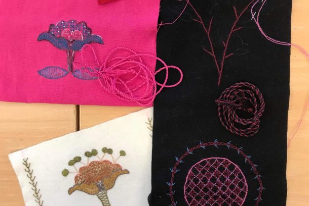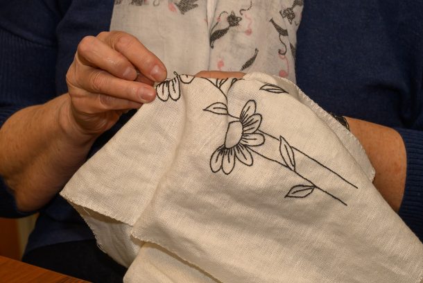 Vi träffas i lokalen och jobbar med våra egna broderier eller hjälps åt med gemensamma projekt.
