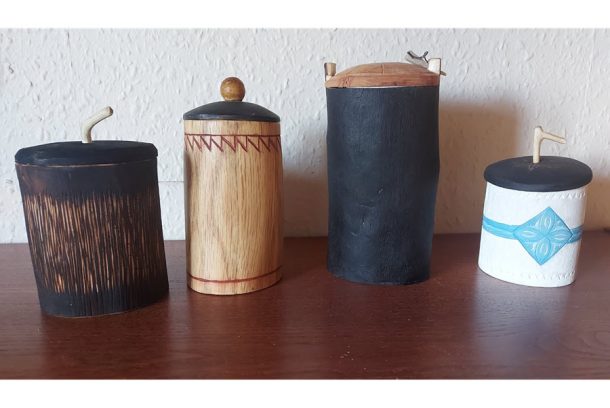 Vi tillverkar burkar i trä för att förvara små ting i. Vi täljer i både färskt och torrt trä....