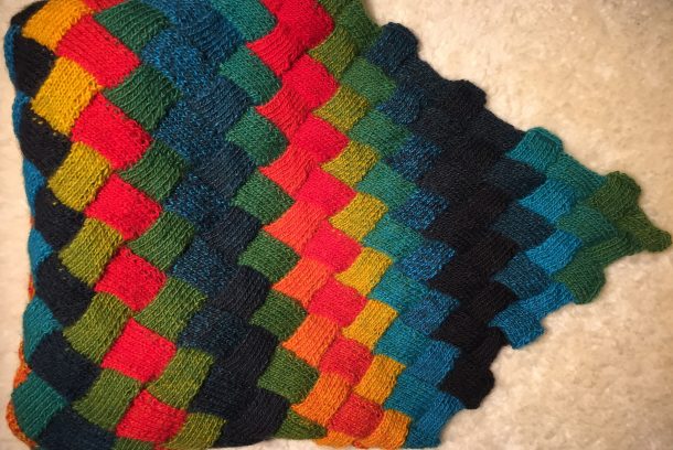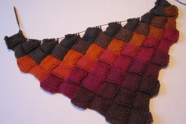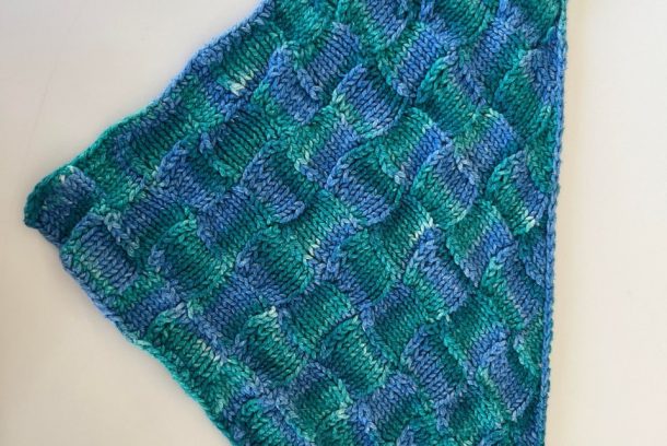Näverstickning, eller entrelac, är rutor stickade i olika riktningar. Man börjar med en rad trianglar som man sedan...